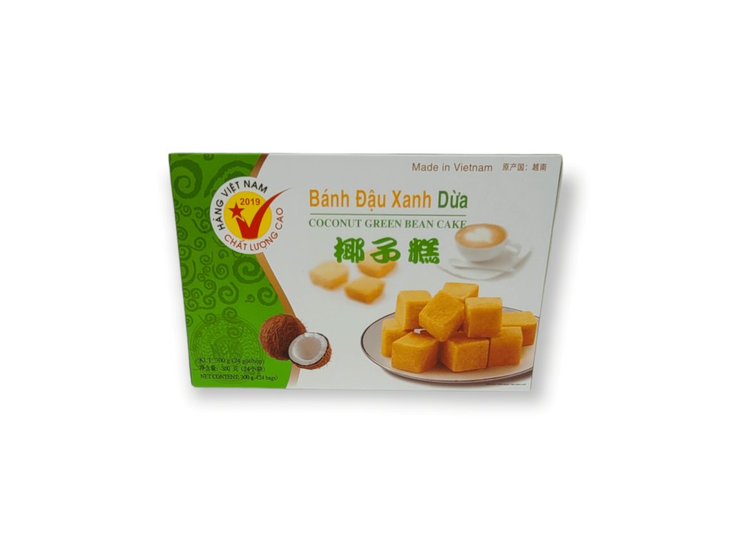 Kostky z fazolí mungo s příchutí kokos představují lahodnou kombinaci tradiční vietnamské receptury a jemné kokosové chuti. Jsou vyrobeny z kvalitního prášku z mungo fazolí, rýžové mouky a přírodního kokosového prášku, který dodává zákuskům krémovou vůni a autentický exotický nádech. Díky své vláčné konzistenci a vyvážené sladkosti se skvěle hodí jako dezert, ke kávě nebo jako lehká svačina. Výrobek je čistě rostlinný, bez konzervantů a barviv.