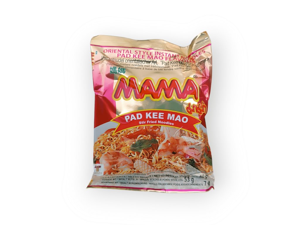MAMA Pad Kee Mao přináší autentickou chuť thajských smažených nudlí s mořskými plody, jemně pikantní a aromatické díky kombinaci česneku, chilli a bazalky. Jemné pšeničné nudle se po zalití a promíchání spojí s kořenící směsí a olejem, čímž vznikne vyvážená chuť sladká, slaná a pikantní. Ideální pro rychlý oběd, večeři nebo lahodnou svačinu doma.