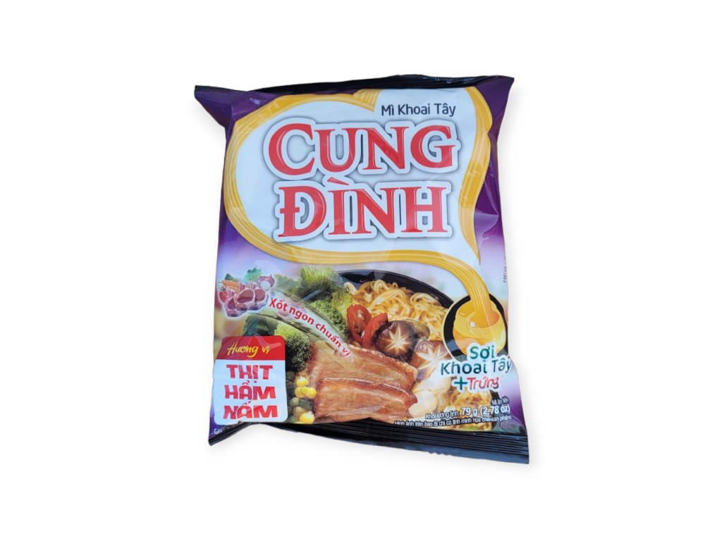 CUNG DINH polévka s dušeným vepřovým a houbami kombinuje jemné pšeničné nudle s bohatou aromatickou kořenící omáčkou, která obsahuje česnek, šalotku, černý pepř a chilli. Polévka je doplněna směsí zeleniny a sojového masa, čímž vzniká plná a vyvážená chuť s autentickým vietnamským nádechem. Stačí zalít horkou vodou a během pár minut si vychutnat sytou a aromatickou polévku.