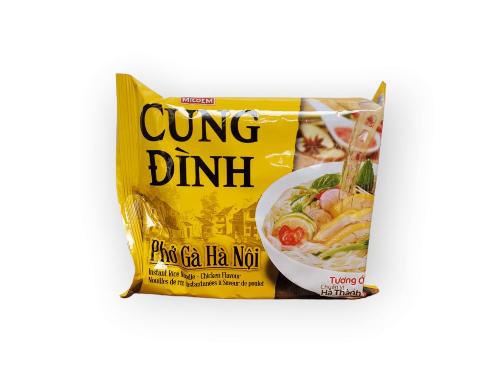 Instantní Pho Ga CUNG DINH 70 g přináší autentickou vietnamskou chuť kuřecí polévky Pho, kterou milují lidé po celém světě. Vyznačuje se jemnými rýžovými nudlemi, výrazným kuřecím vývarem a směsí tradičního koření Pho – skořice, anýzu, kardamomu a zázvoru. V každém balení najdete i chilli omáčku pro intenzivnější chuť a sušenou zeleninu se sójovou náhražkou masa.