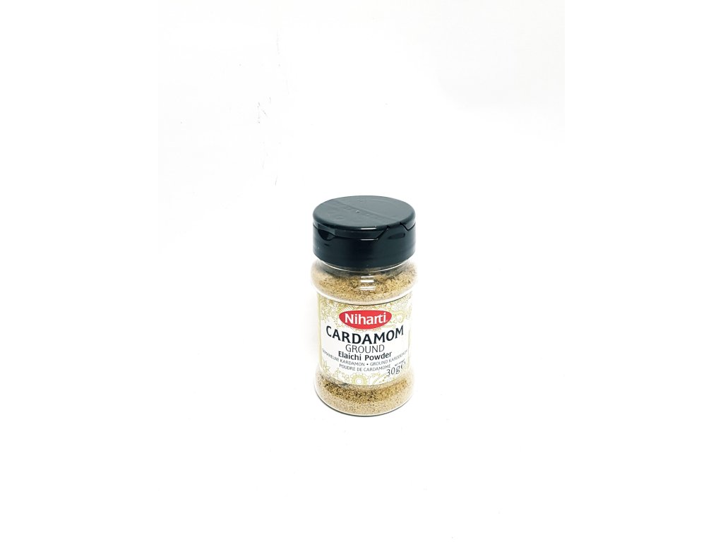 Zelený kardamom mletý NIHARTI 30 g je vysoce kvalitní koření získávané z tobolek rostliny Elettaria cardamomum, známé také jako pravý kardamom. Toto koření je ceněno pro svou intenzivní vůni a chuť s citrusovými a mátovými tóny. Používá se v indické kuchyni k dochucení různých pokrmů, sladkostí a nápojů, jako je masala chai. Nepřipomíná chuť černého kardamomu a nemělo by se s ním zaměňovat.