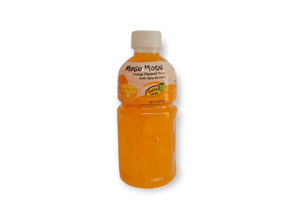 Tropický žvýkací nápoj MOGU MOGU s příchutí pomeranče a kousky kokosového želé nata de coco. Spojuje lahodnou chuť ovoce s hravou texturou želé, která osvěží i pobaví. Ideální pro milovníky originálních exotických nápojů.